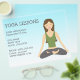 Stylish vector illustration of a beautiful brunette girl doing yoga. The woman is sitting in traditional lotus position. She is wearing a green tank top and dark grey pants. The background is a lovely blue gradient. There are also personalizable text areas for yoga classes information.