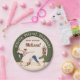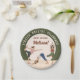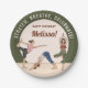 Celebrate a mindful birthday with this yoga-themed paper plate designed by Destei. The design features a beige background with a green curved top bar and curved text area for personalizable message. In the center, there are additional personalizable text areas for custom happy birthday text. Three elegant yoga women illustrations add energy and movement. One flows into dancer pose, another holds downward facing dog and the third balances in tree pose. Each wears a different outfit in pink and black, blue and white and green and brown, creating a lively and harmonious touch. The boho-modern palette gives the plate a warm, grounded and joyful feel perfect for a yoga-inspired birthday celebration.