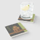 The coasters are gorgeous, a quality feel and heavy weight. They look like a precious archeological find. A rustic stone juxtaposed with a modern floral black and white print. I like the way the print goes slightly imperfect on the cut stone edges giving them a kind-of natural beauty.