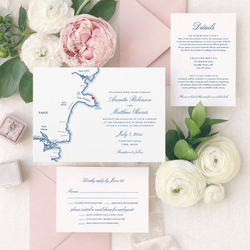 Enhance your wedding invitations with this elegant navy blue envelope featuring a blue map of York, Maine inside and your return address printed in white on the back flap. Perfect for weddings at York Harbour Inn, Union Bluff Meeting House, Stage Neck Inn, Dockside Guest Quarters, and ViewPoint Hotel, these envelopes add a personal touch, capturing the coastal charm of York, Maine. Artwork by Coastal Map Designs.