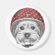 This design features a portrait of a Yorkshire Terrier wearing a teal and red polka dotted helmet.