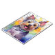 A digital art image of a cheerful Yorkshire Terrier dog is depicted in vibrant watercolors, with splashes of bright colours in the background adding an energetic feel. The playful expression on the dog's face is highlighted by its wide smile and perked ears.