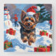 A lively Yorkshire Terrier bounds through the snow, wearing a bright red Christmas hat with joyful holiday spirit. This festive winter scene highlights the playful charm and elegance of the Yorkie, surrounded by the magic of the season. A heartwarming design that captures both the beauty of winter and the personality of this beloved small breed.
