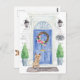 Announce your new address with our stylish announcement featuring a Yorkshire Terrier, blue front door, welcome mat, slate sign, topiaries and a floral wreath set on a grey brick background.