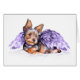 Sweet little Yorkshire Terrier resting on a cloud has purple feathery wings. Yorkie Angel will bring a smile to anyone's face any time of the year!
