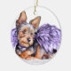 Sweet little Yorkshire Terrier resting on a cloud has purple feathery wings. Yorkie Angel will bring a smile to anyone's face any time of the year!