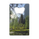 This credit card bottle opener shows a photograph of Yosemite National Park. Taken by my daughter-in-law, Brittany Mann, this gorgeous photograph shows the setting sun peeking through the trees, a lush green valley floor, and majestic mountains. At the bottom of this bottle opener are the words, "Yosemite National Park."