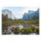 A breathtaking panoramic view of Yosemite Valley, showcasing the iconic granite cliffs of El Capitan and Half Dome. The foreground features a tranquil river winding through a meadow, dotted with smooth rocks and lush green grasses. The sky is a soft blue, with wispy clouds adding to the serene atmosphere.