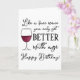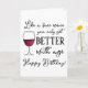 This birthday card reads, “Like a fine wine, you only get better with age” on the front with a cartoon drawing of a wine glass. The inside reads "So cheers to you!” Which can be edited or removed.