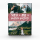 Whimsical and playful wedding keepsake featuring 3 photos of the newlyweds with a typography text that says "you + me = picture perfect." Pink.