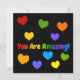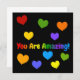 You Are Amazing using colourful ombre rainbow text on a black background for him or her. Matching colour hearts can be moved or removed by the customer.
