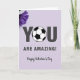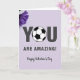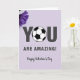 This Valentine’s Day card delivers a warm and encouraging message with a thoughtful mix of style and detail. The background is a soft lavender tone that sets a calm, uplifting mood. Centered on the card, bold dark gray letters spell out “YOU ARE AMAZING!” with strong presence and clarity. The letter “O” in “YOU” is replaced by a black-and-white soccer ball, adding a sporty twist for any soccer fan. In one corner, rich purple aster flowers add a natural accent and visual depth. Beneath the main message, “Happy Valentine’s Day” appears in flowing script, completing a card that feels heartfelt, confident, and full of appreciation.