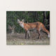 A stealthy red fox at the forest's edge keeps an eye on a sibling.