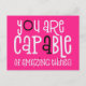 Trendy typography with encouraging quote You are Capable of Amazing Things in white with a touch of black on a hot pink background. The pink background can be changed to different colour if you so wish.