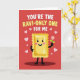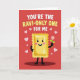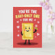 This cute card features a smiling ravioli character in a warm golden-yellow colour with crimped edges and rosy cheeks. It has wide, happy eyes and holds out a small pink flower with a bright green stem, like a sweet little offering. The background is a deep red that sets a romantic mood, with light pink hearts floating all around. Across the top and centre, the card says “YOU’RE THE RAVI-ONLY ONE FOR ME.” The text is in chunky block letters, mostly white with some yellow mixed in, and it stands out clearly against the red. A small shadow under the ravioli helps it feel grounded on the page, while the rest of the design stays simple and flat. It’s a fun, affectionate way to say “you’re my favourite” ❤️