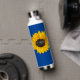 Your are my sunshine quote has text on bright cheerful yellow sunflower original photograph with a royal blue background water bottle. Photograph copyright Ann Powell all rights reserved
