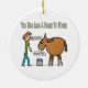 Humourous Lead A Horse To Water design features the old proverb illustrated by a farmer encouraging his horse to take a drink. The horse eyes the water and says "Nope". Illustrated horse expression in cartoon form.