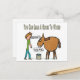 Humorous Lead A Horse To Water design features the old proverb illustrated by a farmer encouraging his horse to take a drink. The horse eyes the water and says "Nope". Illustrated horse expression in cartoon form.