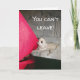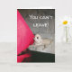 This greeting card features a wild-eyed Chihuahua dog tugging at a robe with the words, 'You can't leave!' The inside of the card reads, 'I will miss you too much!'