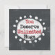Bold text reading "You Deserve Unlimited Hugs" is centred against a grey background. The black text sits on a white circle with large textured white dots around it, providing a playful contrast against the solid colour backdrop.