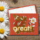 Celebrate achievements with this retro-inspired 'You Did Great!' postcard featuring playful typography and a cheerful flower mascot. Perfect for graduations, promotions, or any occasion worth celebrating! Customise the colours of the text, flower, and background to match your style or the recipient's favourite colours. A fun and versatile way to spread positivity and encouragement!