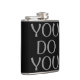 The flask itself is fine. It’s a cheap flask, obviously bought in bulk, however am prepared to overlook that. Given that it is a personalized item, I would have liked to have seen gift boxing instead of the generic packaging. Terrible printing, and/or quality. It’s a cheap, tacky vinyl. It is not cut straight and is also applied in a way that it is overhanging the bottom, causing the glue to catch on items and it will eventually roll and tear, damaging the wrap.