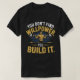 This black t-shirt features the motivational text "YOU DON'T FIND WILLPOWER, YOU BUILD IT." arranged around a central graphic. The word "WILLPOWER" is large and in a bold yellow font with a dark outline. The graphic shows a muscular individual, who appears to be a light-skinned man, holding a barbell across his shoulders, suggesting a squat exercise. The background has a blue and grey textured design.