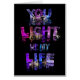 This design is made from photographs of hand cast, hand wired random colour change letters, standing in still water with floating foil hexagons and honeysuckle flowers.