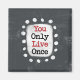 Bold text reading "You Only Live Once" is centred against a grey background. The black text sits on a white rectangle with large textured white dots around it, providing a playful contrast against the solid colour backdrop.