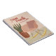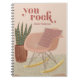 This spiral notebook features a boho style living room with a pink retro, mid-century modern rocking chair, on a sheepskin rug, with a snake houseplant in a terracotta planter. This notebook encourages the bearer with retro-inspired type that says "you rock". This notebook is customisable with the recipient's name in mauve on the bottom.