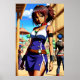 A portrait of a young African lady with brown hair wearing a blue and white dress standing in the street in a small African village. This is a AI generated art.