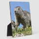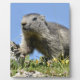 Young Alpine marmot (Marmota marmota) on the blue sky background, in the French Alps, Savoie department at La Plagne