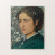 This design features a painting by the artist Edward Robert Hughes (1851–1914). It shows a beautiful young woman; she is a brunette with a strong and determined look in her eyes. She is wearing a green dress and has long black earrings hanging from her earlobes. Her mouth is closed and her lips are red. In the background are some white flowers on the branches of trees; the woman is wearing a few of the flowers in her hair. The original artwork by E.R. Hughes was painted in 1875.