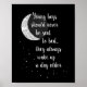An lovely print for your baby boy's nursery wall that quotes from the story of Peter Pan, "Young boys should never be sent to bed... they always wake up a day older", in a cursive text with a hand-lettered look. Contemporary typography whimsically printed in white on a trendy black background decorated with a crescent moon and a scattering of little stars.