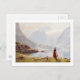 A young woman in peasant clothes stands looking at a Norwegian Fjord. Vintage fine art by Hans Andreas Dahl.