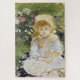 This design features a painting by the French Impressionist artist Berthe Morisot (1841–1895). It depicts a young girl seated in a garden as she holds a doll on her lap. There are some beautiful flowers blooming in various colours behind the girl, who is smiling happily. The young girl appears to be sitting on a blanket on the grass in the garden. The original art was painted by Berthe Morisot in 1883.