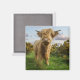 A friendly young Scottish Highland cow is getting close at sunrise. You can even see his eye which is typically covered by his shaggy hair.