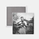 A young man holding a cat is an adorable photograph on this magnet. Sure to look great on that fridge.