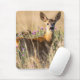 Photograph of a young roe dear surrounded by blue flowers and long grass.