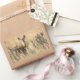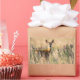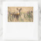 Photograph of a young roe dear surrounded by blue flowers and long grass.