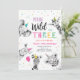 Set the tone for your party with these elegant invitations with a Party Animals Young Wild and Three theme. For a girls Birthday.