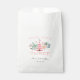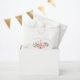 Adorable favour bags for your wild one's third birthday party feature a pink teepee illustration flanked by pastel peach and mint flowers. "Young, Wild & Three" appears in peach lettering. Personalise with the birthday girl's name and party date.