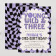 This Young Wild and Three birthday invitation features a trendy lavender and charcoal checkerboard background with playful retro typography and a soft scalloped frame. Perfect for stylish, aesthetic toddler birthday parties with a modern Pinterest-inspired vibe.