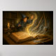 A young apprentice conjures glowing symbols above an ancient book in a mystical setting. Fantasy illustration with magical light, floating runes and sparkles. Ideal for fairy tale and storytelling themes.
