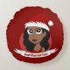Round pillow with an illustration of beautiful young African American woman with wavy hair and Santa Claus' hat; with editable text template, Christmas holidays design with a red background