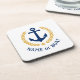 An elegant set of nautical themed cork back beverage coasters with your personalised boat name, family name or other desired text. Features a custom designed boat anchor with gold style laurel leaves and a star on white or easily customise the base colour to match your current decor or theme.