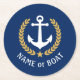 A nautical themed, personalised set of round paper coasters with your boat name, family name or other desired text as needed. Featuring a custom designed vintage boat anchor, gold style laurel leaves and star emblem on navy blue or easily adjust the primary colour to match your current theme.