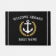 Personalise your home with a Welcome Aboard doormat and your boat name, family name or other desired text. Featuring a custom designed boat anchor with a gold style laurel leaves emblem and nautical rope stripes in white on black or easily adjust the primary colour to match your current theme.