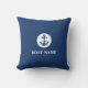 Your Boat Name Rope & Anchor White and Navy Blue Throw Pillow Cushion.