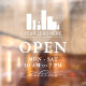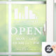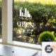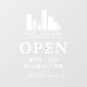 Open hours window clings personalised with your logo above OPEN written in elegant letters, and welcome in a swirly script. Add your opening hours. A clean, minimalist look.